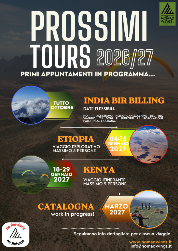Al primo viaggio nella spettacolare cornice della Kerio Valley, Kenya, se ne sono progressivamente aggiunti molti altri permettendo a Nomad Wings di affermarsi come una delle realtà di riferimento nel panorama dei viaggi internazionali in parapendio. Una continua crescita ed un sempre più fitto calendario di eventi che registra l’entusiasmo dei numerosi piloti che ne prendono parte e che manifestano continui apprezzamenti per elevati standard tecnici, organizzativi e professionali.